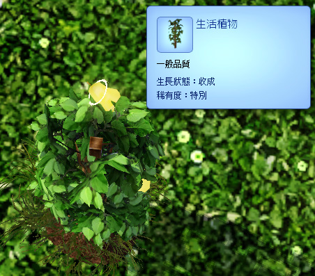 「不知名的特別種子」收成期大約十天,在這十天內會經歷「已種植」、「發芽」、「成長」及「收成」期。千萬不要看到幾天還是「已種植」就以為這是失敗的種子,因為它需要非常長的時間成長。如果生命果收成,模擬市民可以取得 2 個生命果。